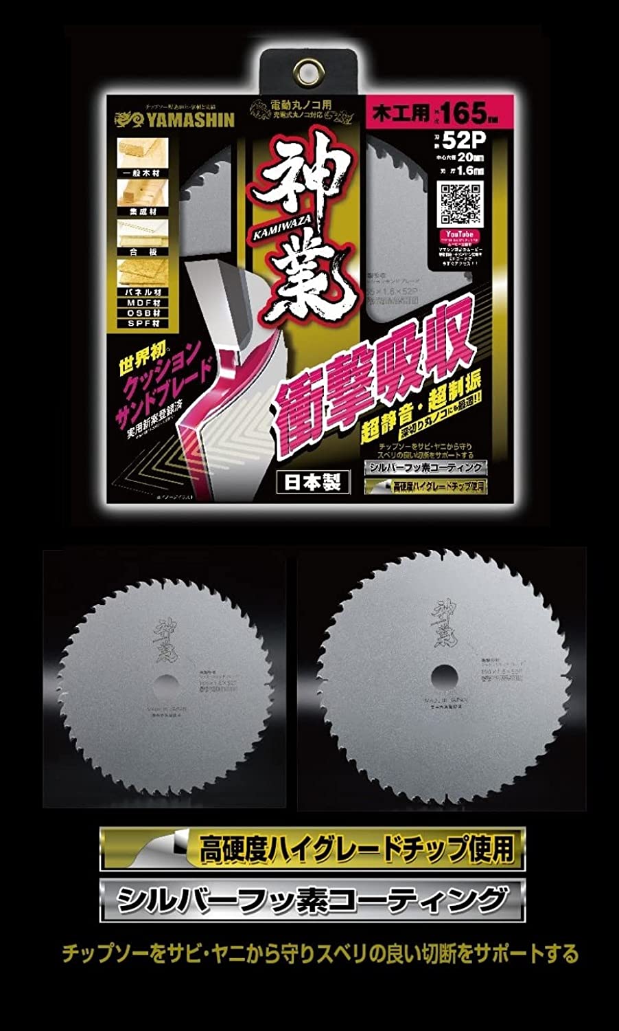 山真製鋸(YAMASHIN) 神業チップソー 165mm×1.6mm 52枚刃 クッションサンドブレード 超静音 超制振 シルバーフッ素コーティング 木工用