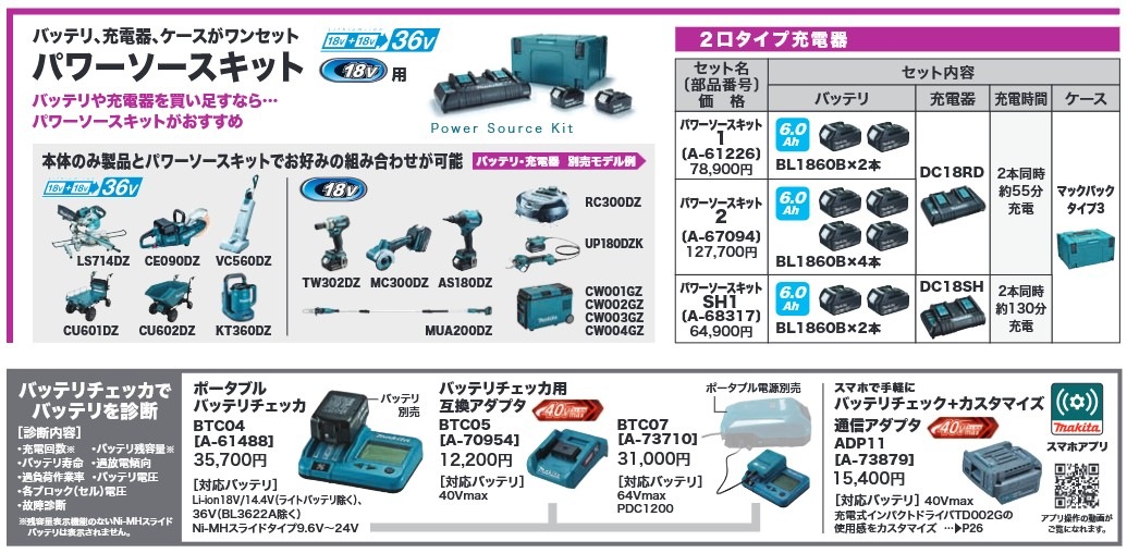 インパクトドライバー、ハンマードリル、丸ノコ、グラインダー、チェーンソー、ブロワー、草刈機など、マキタ18Vシリーズ全般に対応!